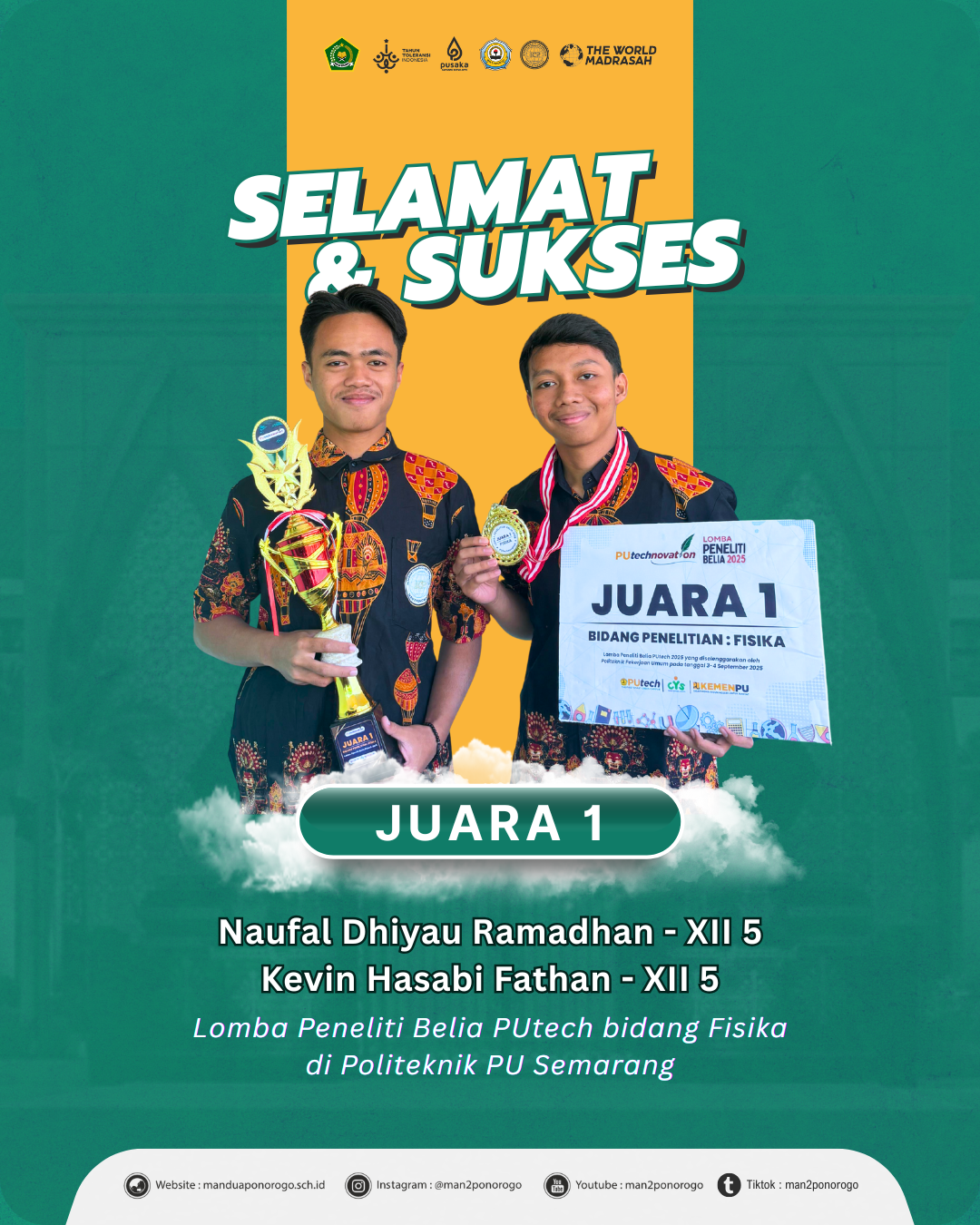 Ponorogo-(15/9/2025) – Tim MAN 2 Ponorogo berhasil meraih juara 1 lomba penelitian pada ajang perlombaan Peneliti belia PUtech bidang Fisika di Politeknik PU Semarang.