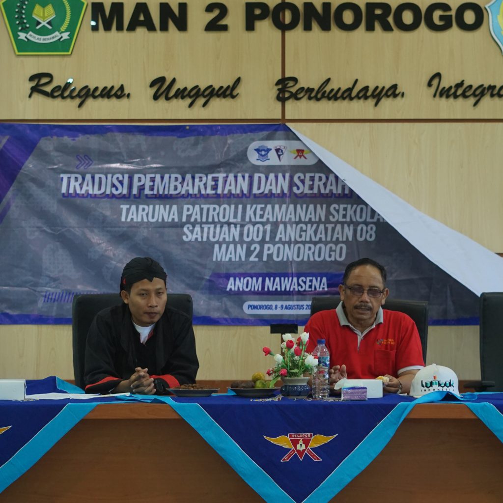Prosesi serah terima jabatan Taruna PKS MAN 2 Ponorogo yang dilaksanakan pada tanggal 09 Agustus 2023 ditandai dengan pelantikan dan penyematan baret. “ Harapan dari angkatan 07 untuk angkatan 08 ke depannya semoga PKS MAN 2 Ponorogo jauh lebih maju dari masa ke masa, dan terus menjadi pelopor kedisiplinan di manapun berada.” Ujar Ahmad Faizul Fawwaid selaku ketua Taruna PKS 07.