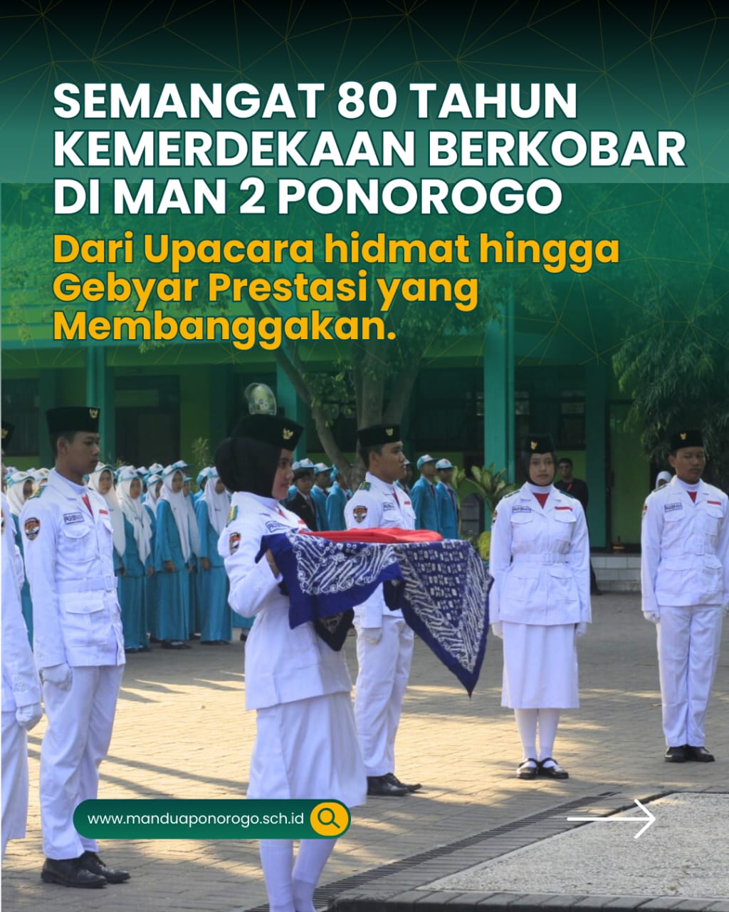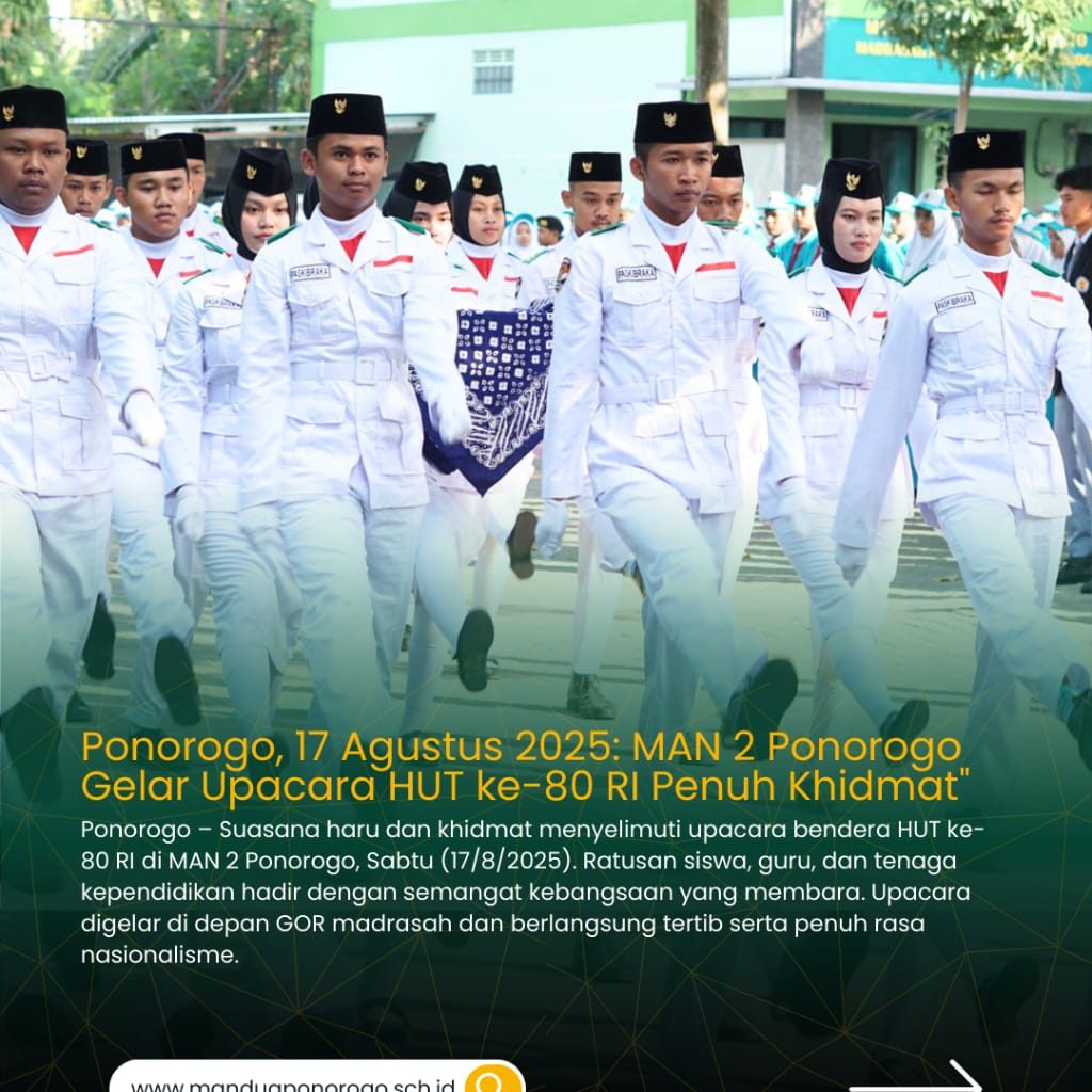Dengan semangat nasionalisme yang menggelora, upacara peringatan HUT ke-80 RI di MAN 2 Ponorogo berjalan lancar dan meninggalkan pesan penting: kemerdekaan harus terus diisi dengan perjuangan, kerja keras, dan prestasi generasi muda.