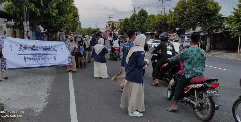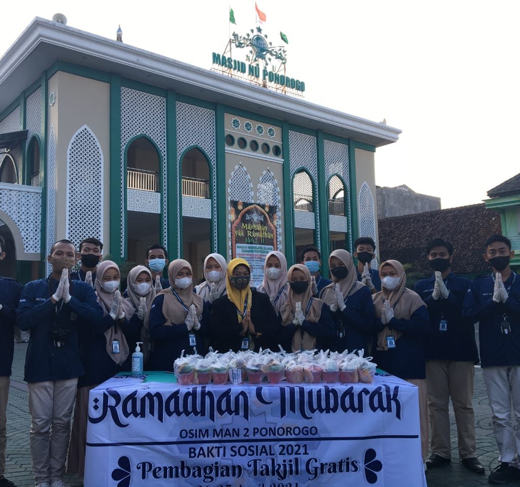 26-27 April 2021. OSIM MAN 2 Ponorogo mengadakan event Bakti Sosial dalam bentuk bagi bagi takjil gratis dalam rangka mengisi kegiatan bulan suci Ramadhan. Kegiatan yang dilaksanakan selama 2 hari ini berlokasi di 2 titik yang berbeda pada masing-masing hari. Di hari pertama berlokasi di Masjid Agung Ponorogo dan Jln Ir. Juanda, sedangkan hari kedua berlokasi di Jln. Letjen Suprapto dan Masjid NU Ponorogo.
