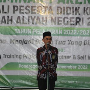 Ponorogo, 05/11/2022. Hari ini MAN 2 Ponorogo melaksanakan kegiatan Seminar Parenting dan Motivasi bagi wali serta peserta didik kelas X tahun ajaran 2022/2023. Seminar Parenting dengan tema “Menjadi Orang Tua yang dirindukan” bagi wali peserta didik dilaksanakan di Gedung Olahraga MAN 2 Ponorogo, sementara Seminar Motivasi untuk peserta didik dengan tema “Menjadi pribadi tangguh, pemenang kehidupan” bertempat di Aula MAN 2 Ponorogo.