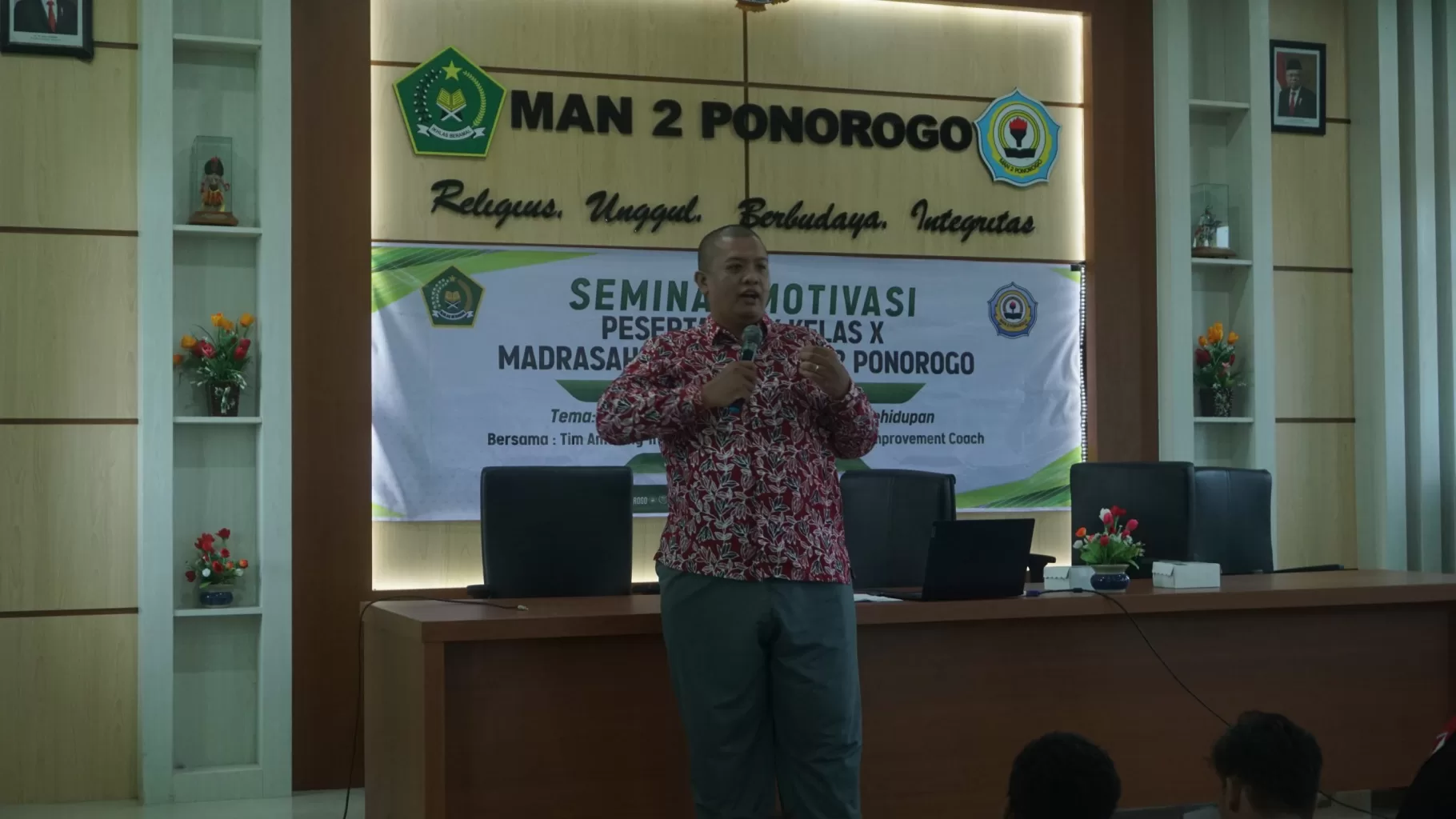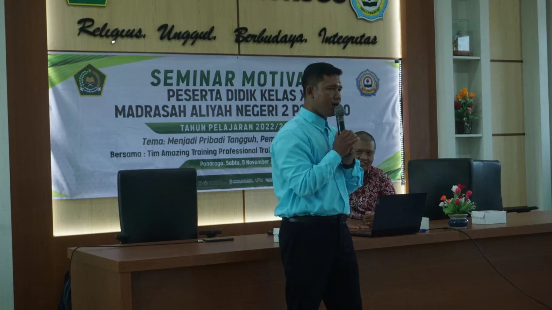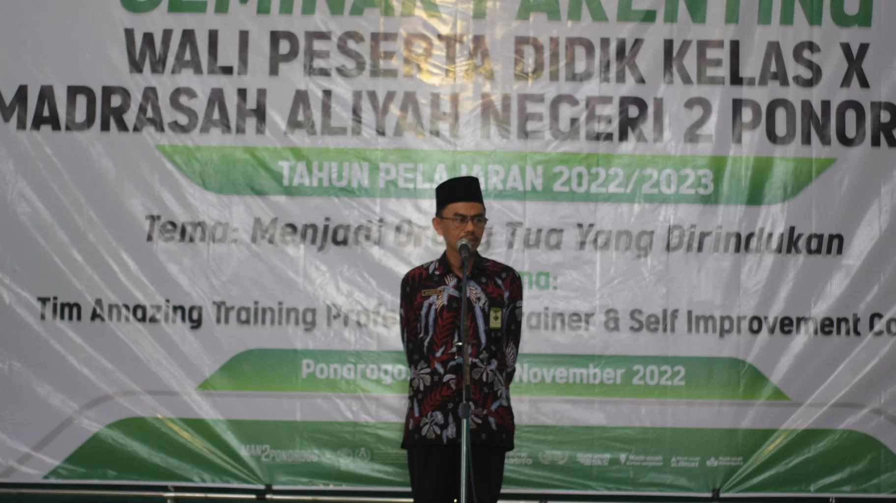 Ponorogo, 05/11/2022. Hari ini MAN 2 Ponorogo melaksanakan kegiatan Seminar Parenting dan Motivasi bagi wali serta peserta didik kelas X tahun ajaran 2022/2023. Seminar Parenting dengan tema “Menjadi Orang Tua yang dirindukan” bagi wali peserta didik dilaksanakan di Gedung Olahraga MAN 2 Ponorogo, sementara Seminar Motivasi untuk peserta didik dengan tema “Menjadi pribadi tangguh, pemenang kehidupan” bertempat di Aula MAN 2 Ponorogo.