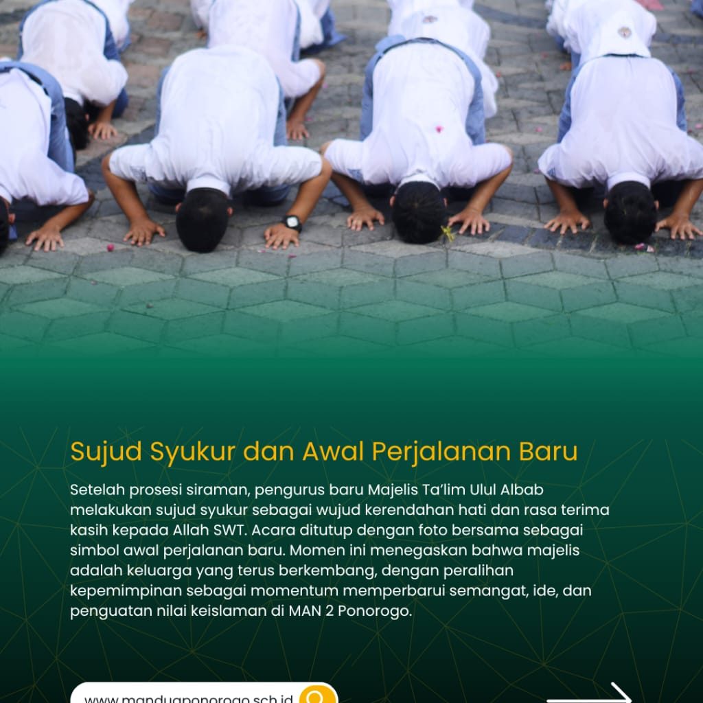Setelah prosesi siraman, seluruh pengurus baru melakukan sujud syukur, sebuah ekspresi kerendahan hati dan rasa terima kasih kepada Allah SWT atas karunia dan kepercayaan yang diberikan. Momen ini menjadi penutup rangkaian acara yang sakral sebelum akhirnya ditutup dengan sesi foto bersama, mengabadikan awal perjalanan mereka.