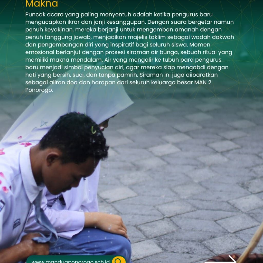 Puncak acara yang paling menyentuh adalah ketika pengurus baru mengucapkan ikrar dan janji kesanggupan. Dengan suara bergetar namun penuh keyakinan, mereka berjanji untuk mengemban amanah dengan penuh tanggung jawab, menjadikan majelis ta’lim sebagai wadah dakwah dan pengembangan diri yang inspiratif bagi seluruh siswa. Momen emosional berlanjut dengan prosesi siraman air bunga, sebuah ritual yang memiliki makna mendalam. Air yang mengalir ke tubuh para pengurus baru menjadi simbol penyucian diri, agar mereka siap mengabdi dengan hati yang bersih, suci, dan tanpa pamrih. Siraman ini juga diibaratkan sebagai aliran doa dan harapan dari seluruh keluarga besar MAN 2 Ponorogo.