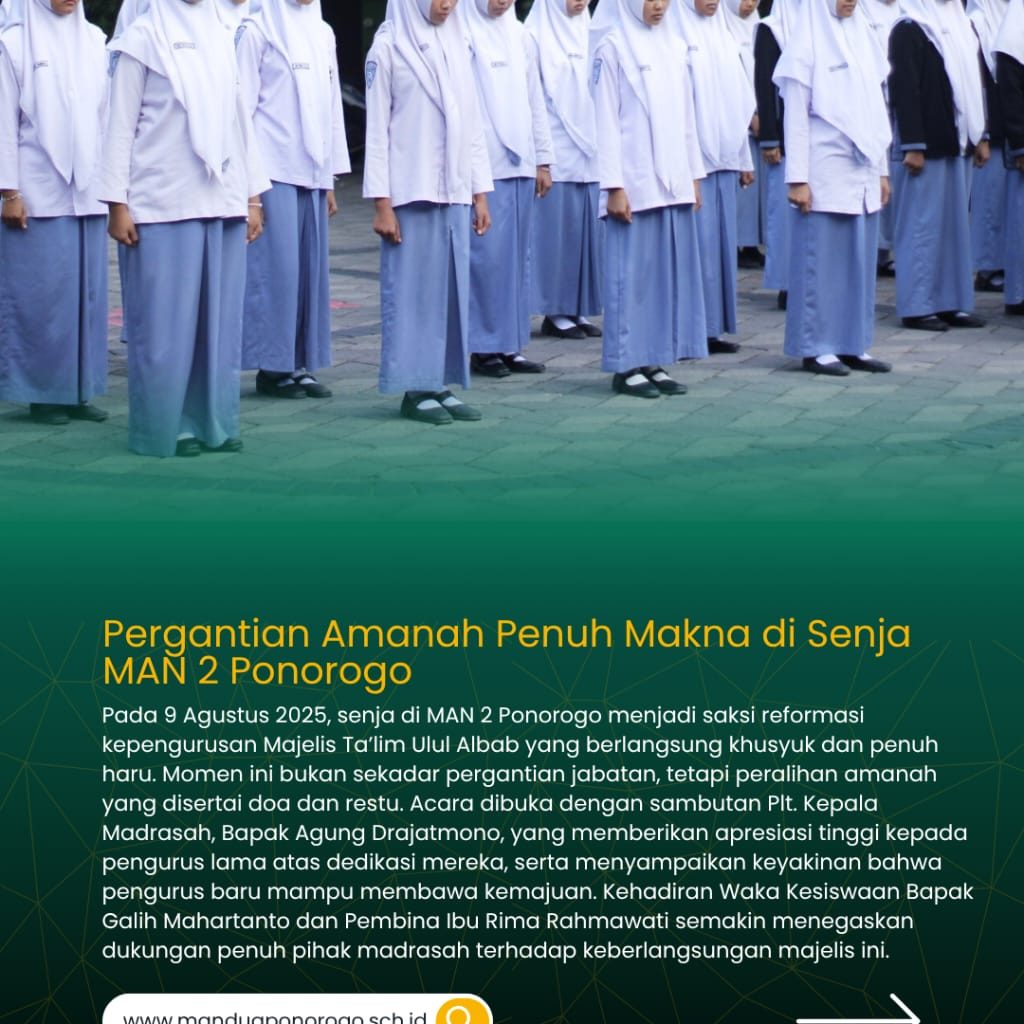 Ponorogo (09/08/25) – Senja yang menghias langit MAN 2 Ponorogo menjadi saksi bisu sebuah babak baru dalam sejarah Majelis Ta’lim Ulul Albab. Halaman sekolah yang biasanya ramai, sore itu diselimuti suasana khusyuk dan haru, menandai momen reformasi kepengurusan yang sarat makna. Acara ini bukan sekadar seremonial pergantian jabatan, melainkan sebuah peralihan amanah yang diiringi doa, restu, dan niat suci.