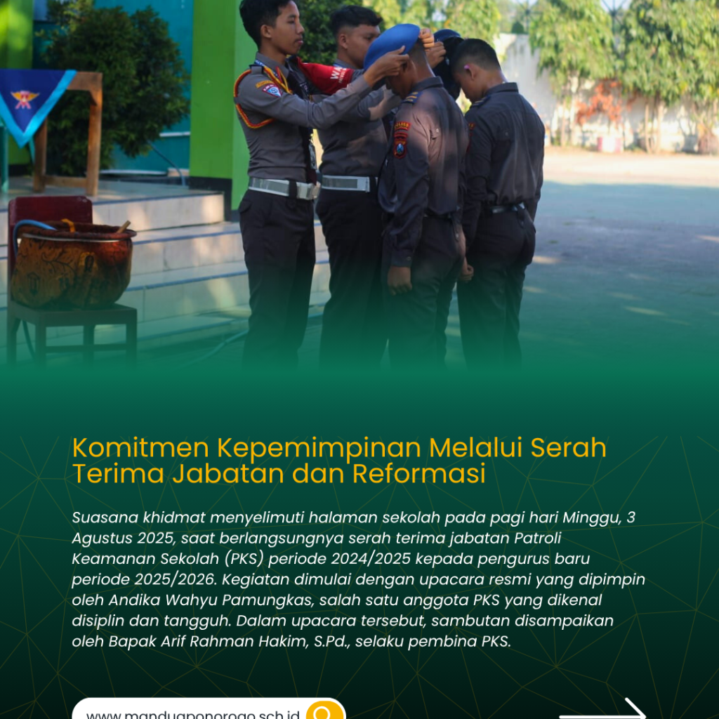Minggu, 3 Agustus 2025 di MAN 2 Ponorogo, sedang berlangsung serah terima jabatan Patroli Keamanan Sekolah (PKS) periode 2024/2025 kepada pengurus baru periode 2025/2026 dengan Suasana Penuh khidmat menyelimuti halaman sekolah. Kegiatan ini dimulai dengan upacara resmi yang dipimpin oleh Andika Wahyu Pamungkas, salah satu anggota PKS yang dikenal disiplin dan tangguh.