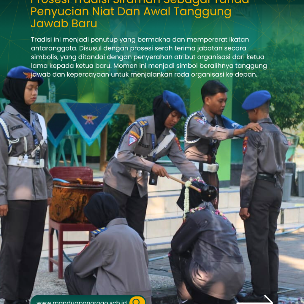 Kegiatan tersebut diawali dengan sambutan oleh Bapak Arif Rahman Hakim, S.Pd., selaku pembina PKS. Dilanjutkan dengan prosesi tradisi siraman sebagai tanda penyucian niat dan awal Tanggung Jawab baru. Tradisi ini menjadi penutup yang bermakna untuk mempererat ikatan antar anggota. Disusul dengan prosesi serah terima jabatan secara simbolis, yang ditandai dengan penyerahan atribut organisasi dari ketua lama kepada ketua baru. Momen ini menjadi simbol beralihnya tanggung jawab dan kepercayaan untuk menjalankan roda organisasi ke depan.