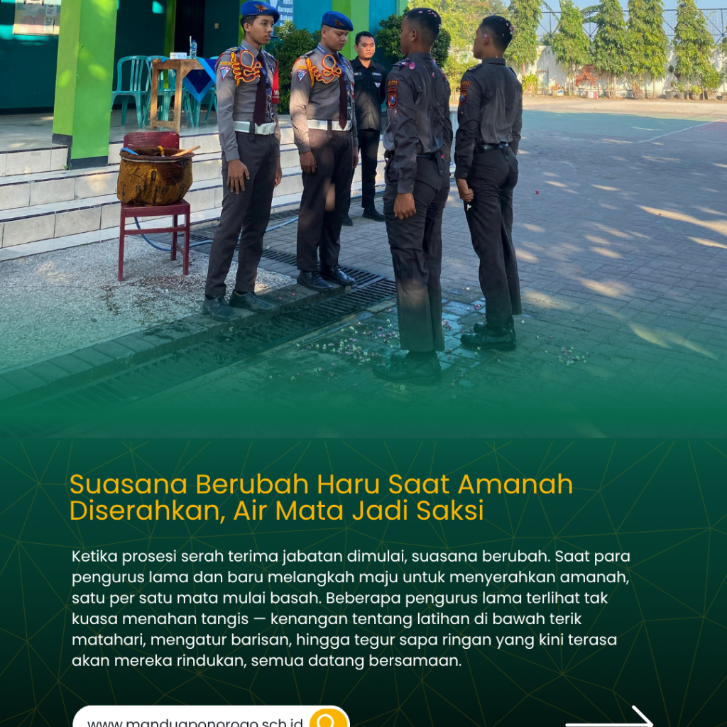 Suasana menjadi berubah Ketika prosesi serah terima jabatan dimulai, saat para pengurus lama dan baru melangkah maju untuk menyerahkan amanah, satu per satu mata mulai basah, beberapa pengurus lama terlihat tak kuasa menahan tangis — kenangan tentang latihan di bawah terik matahari, mengatur barisan, hingga tegur sapa ringan yang kini terasa akan mereka rindukan.