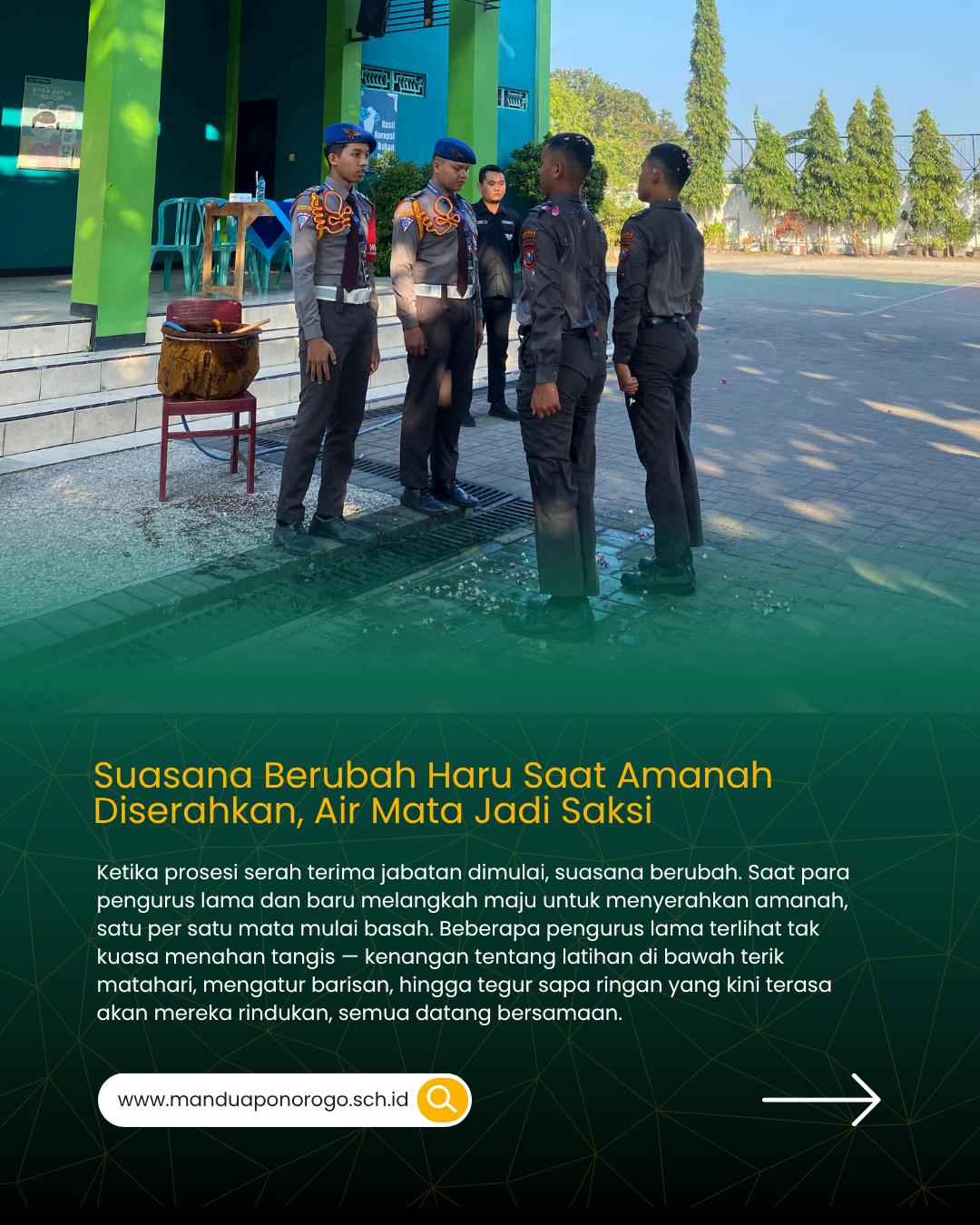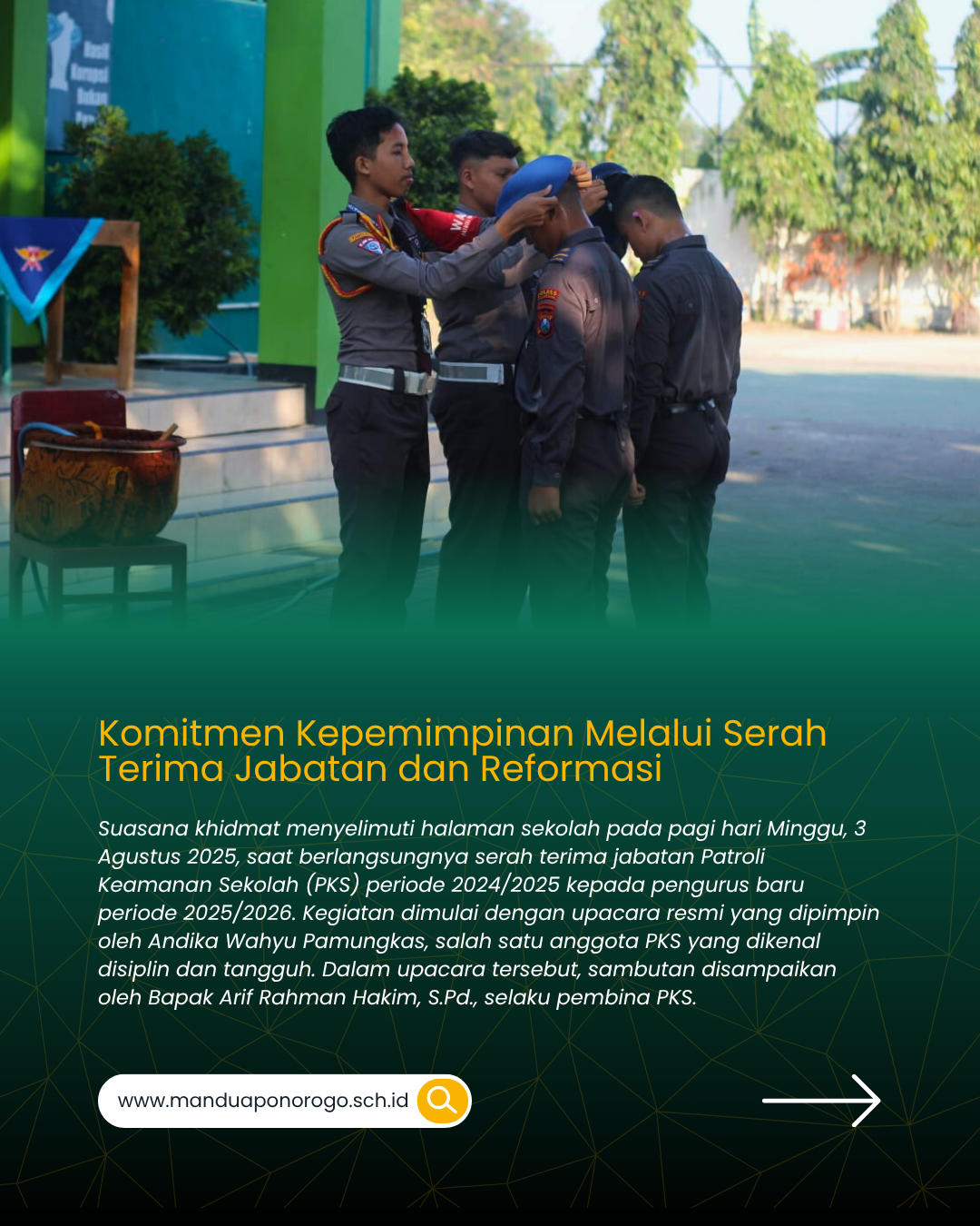 Minggu, 3 Agustus 2025 di MAN 2 Ponorogo, sedang berlangsung serah terima jabatan Patroli Keamanan Sekolah (PKS) periode 2024/2025 kepada pengurus baru periode 2025/2026 dengan Suasana Penuh khidmat menyelimuti halaman sekolah. Kegiatan ini dimulai dengan upacara resmi yang dipimpin oleh Andika Wahyu Pamungkas, salah satu anggota PKS yang dikenal disiplin dan tangguh.