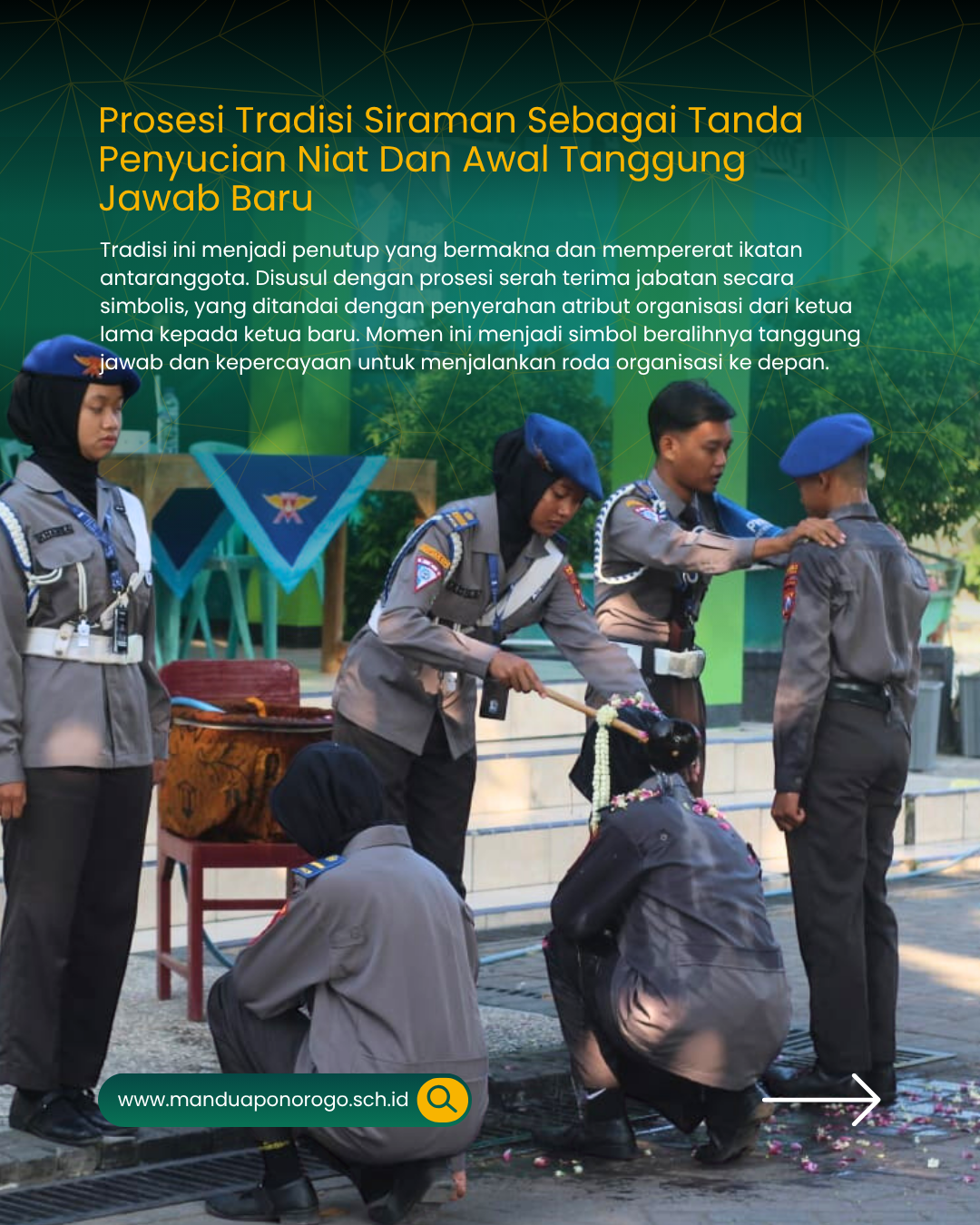 Kegiatan tersebut diawali dengan sambutan oleh Bapak Arif Rahman Hakim, S.Pd., selaku pembina PKS. Dilanjutkan dengan prosesi tradisi siraman sebagai tanda penyucian niat dan awal Tanggung Jawab baru. Tradisi ini menjadi penutup yang bermakna untuk mempererat ikatan antar anggota. Disusul dengan prosesi serah terima jabatan secara simbolis, yang ditandai dengan penyerahan atribut organisasi dari ketua lama kepada ketua baru. Momen ini menjadi simbol beralihnya tanggung jawab dan kepercayaan untuk menjalankan roda organisasi ke depan.