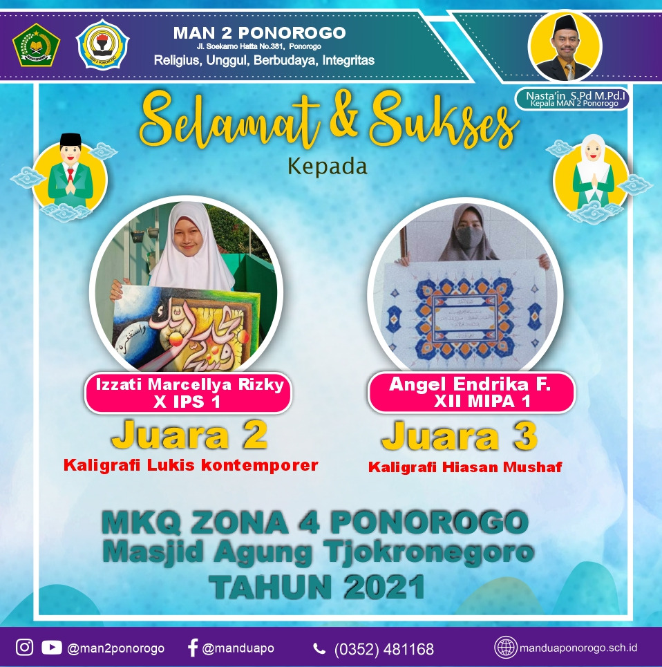 Ponorogo_ Izzati Marcellya Rizky, siswi kelas X IPS 1 berhasil mempersembahkan pialanya untuk MAN 2 Ponorogo. Jerih payah Izzati Marcellya Rizky terbayarkan dengan raihan juara 2 Kaligrafi Lukis Kontemporer yang diselenggarakan oleh Pemerintah Kabupaten di Masjid Agung Tjokronegoro. Dalam sesi wawancara yang dilakukan secara virtual, Izza mengatakan, “Saya mengikuti lomba ini untuk mengisi waktu luang”.