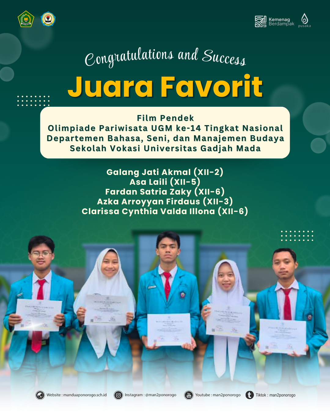 Ponorogo (25/12) — Siswa MAN 2 Ponorogo berhasil meraih Juara Favorit dalam ajang Olimpiade Pariwisata UGM ke-14 tingkat nasional yang diselenggarakan pada 1–15 November 2025 di Universitas Gadjah Mada (UGM), Yogyakarta.