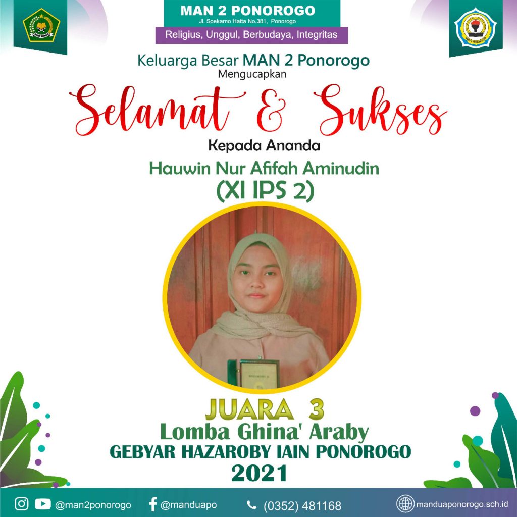 MAN 2 Ponorogo menambah koleksi piala dengan diraihnya juara 3 lomba Ghina’ Arabiya di tingkat nasional dan umum atas nama Hauwin Nur Afifah Aminudin kelas XI IPS 2. Lomba yang digelar secara maraton pada tanggal 15 Januari hingga 17 Februari 2021 ini diselenggarakan secara online dan diikuti oleh peserta dari berbagai daerah. Para peserta mengirimkan video penampilannya melalui akun pribadi di instagram.