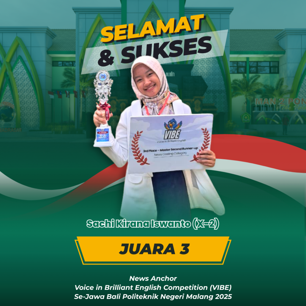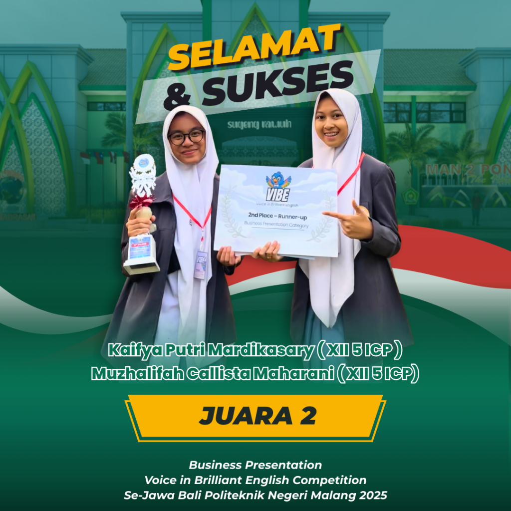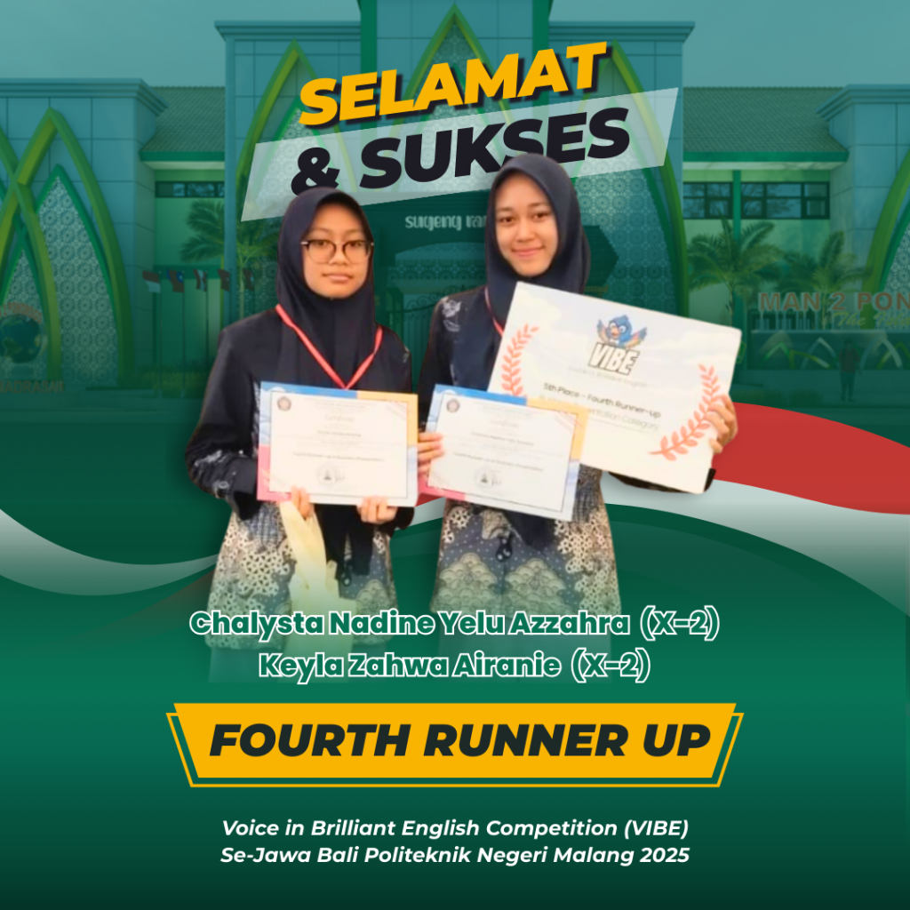 Ponorogo (18/08/25)– MAN 2 Ponorogo kembali menorehkan prestasi membanggakan melalui ajang Voice in Brilliant English Competition (VIBE) tingkat Se-Jawa Bali yang diselenggarakan oleh Politeknik Negeri Malang. Dalam kompetisi bergengsi tersebut, dua siswi kelas X-2, Chalysta Nadine Yelu Azzahra dan Keyla Zahwa Airanie, berhasil meraih gelar Fourth Runner Up. Babak final sekaligus pengumuman juara dilaksanakan pada tanggal 14 Agustus 2025 di Politeknik Negeri Malang.