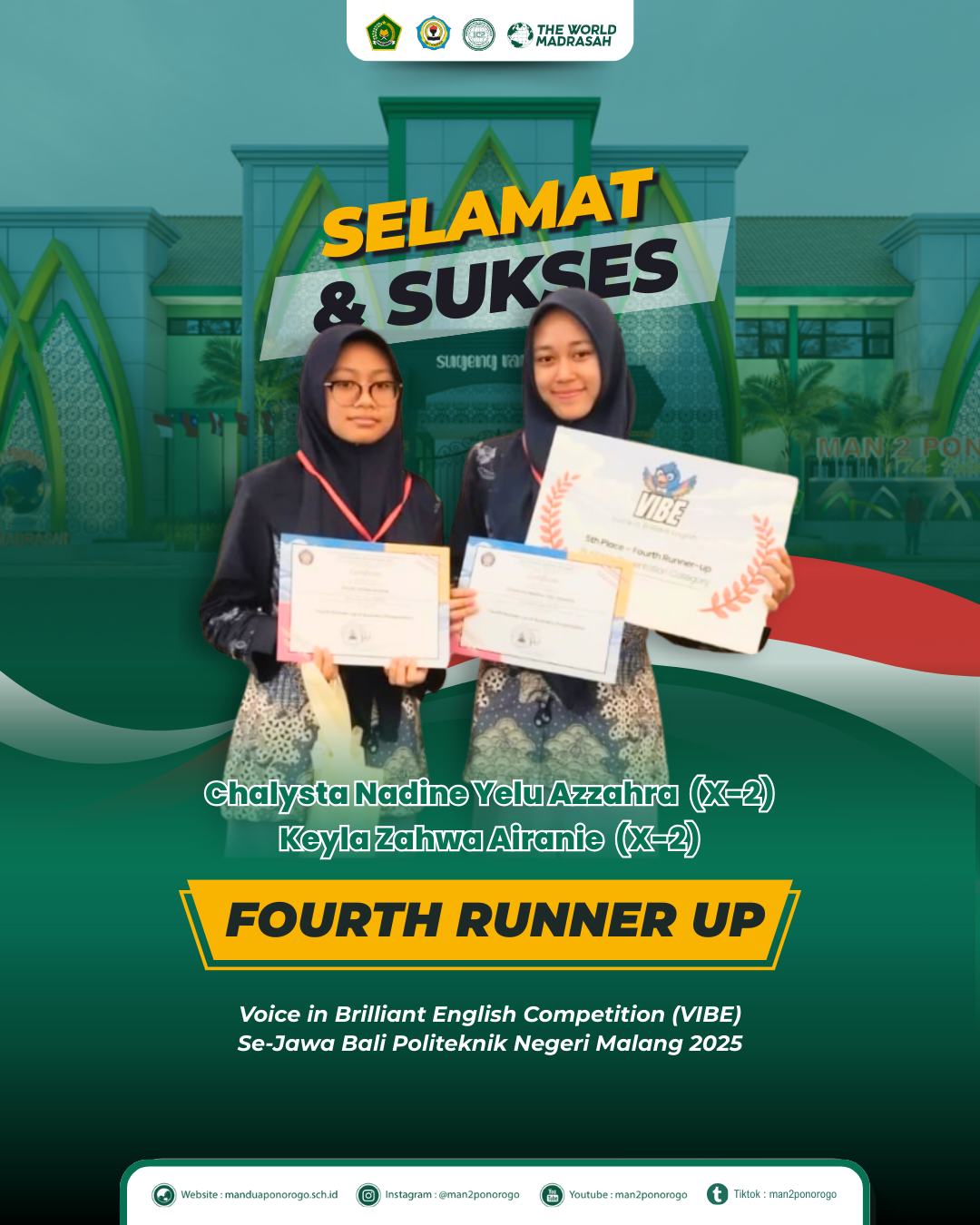 Ponorogo (18/08/25)– MAN 2 Ponorogo kembali menorehkan prestasi membanggakan melalui ajang Voice in Brilliant English Competition (VIBE) tingkat Se-Jawa Bali yang diselenggarakan oleh Politeknik Negeri Malang. Dalam kompetisi bergengsi tersebut, dua siswi kelas X-2, Chalysta Nadine Yelu Azzahra dan Keyla Zahwa Airanie, berhasil meraih gelar Fourth Runner Up. Babak final sekaligus pengumuman juara dilaksanakan pada tanggal 14 Agustus 2025 di Politeknik Negeri Malang.