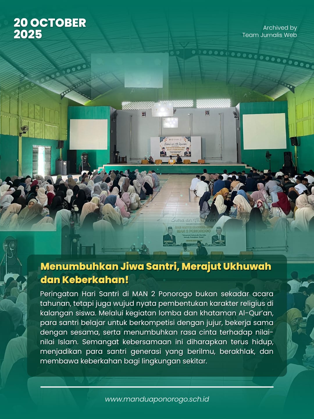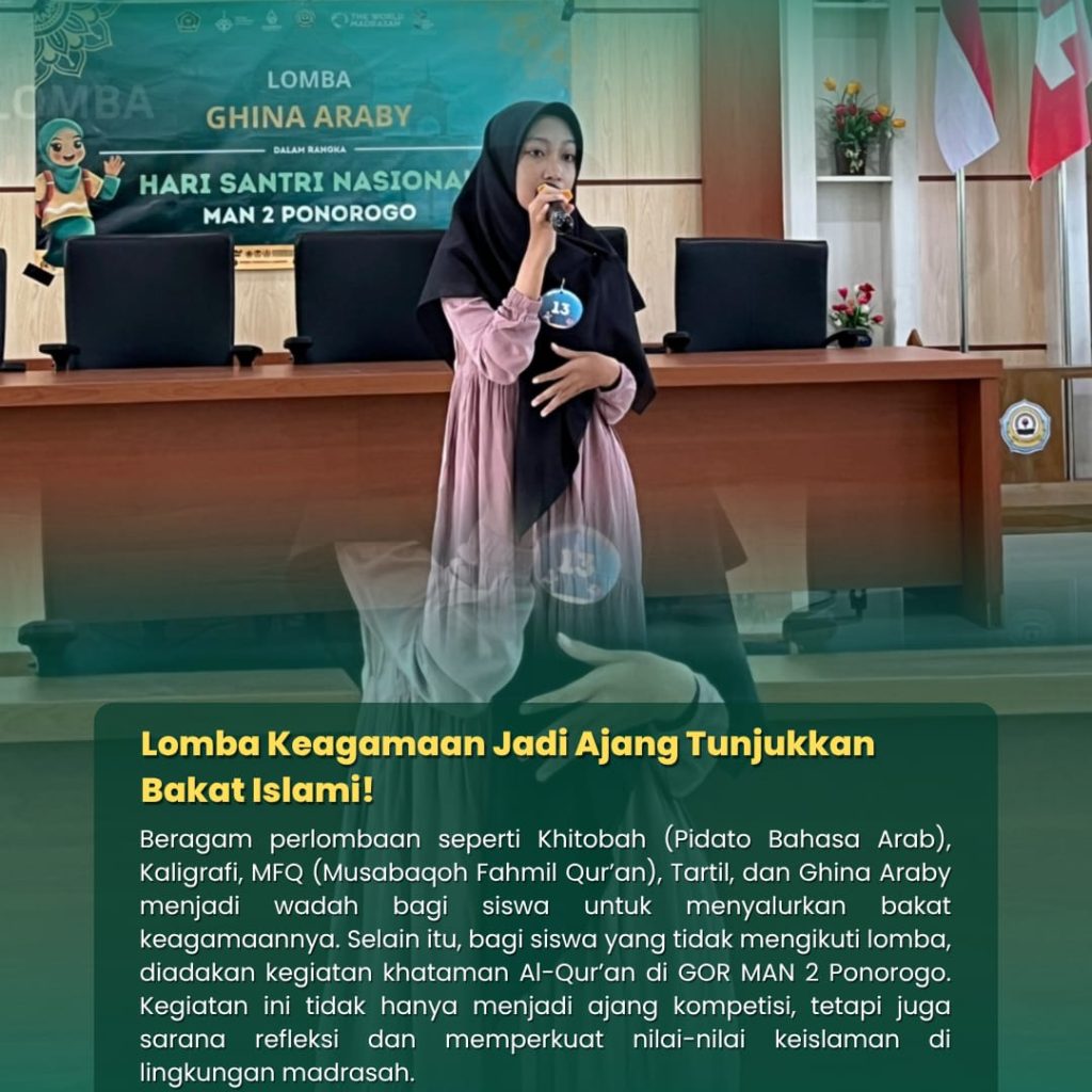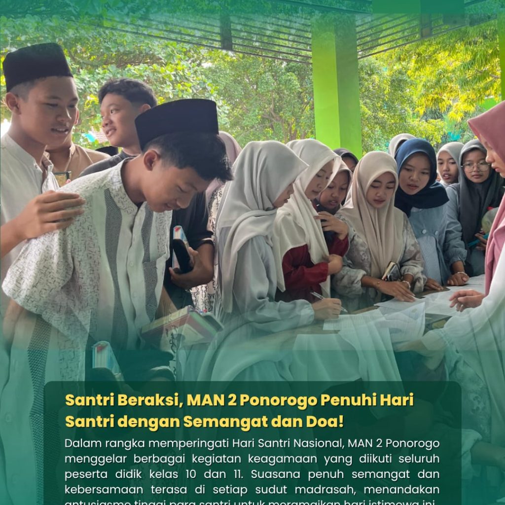 Ponorogo (20/10) — Dalam rangka memperingati Hari Santri Nasional, MAN 2 Ponorogo menyelenggarakan berbagai kegiatan keagamaan yang diikuti oleh seluruh peserta didik kelas X dan XI dengan penuh semangat.