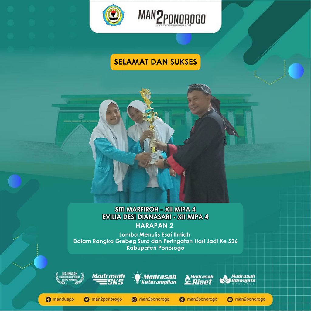 Tiga tim MAN 2 Ponorogo berjaya dengan meraih juara 2 yaitu Syadhach Amaliya (XI MIPA 2) dan Itsna Mar’atul Qibtiyya (XI MIPA 2) dengan esai berjudul “Salam-Salim : Pendidikan Karakter Pada Siswa Autis Spectrum Disorder Berbasis Gamifikasi 4X (explore, example, expansion, examination ). Sedangkan tim yang terdiri dari Nike Audina Dwi Agustina (XII MIPA 4) dan Chelsea Fikharine (XII MIPA 4) meraih juara harapan 1 dengan esai bertajuk “Ponorogo City Tourism Application sebagai media publikasi tempat pariwisata di Ponorogo.” Dan tim yang terdiri dari Siti Marfiroh (XII MIPA 4) dan Evilia Desi Dianasari (XII MIPA 4) meraih juara harapan 2 dengan esai berjudul Pemanfaatan Media ”animals card” untuk Meningkatkan Kemampuan Menulis Kalimat Sederhana Siswa Tunagrahita di Slahung Ponorogo.