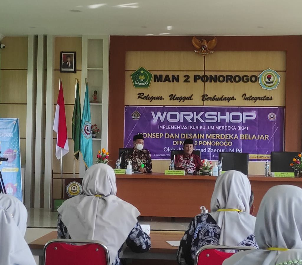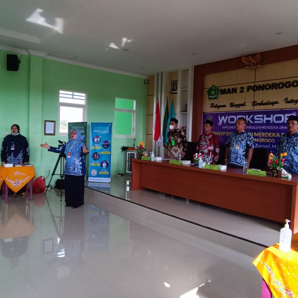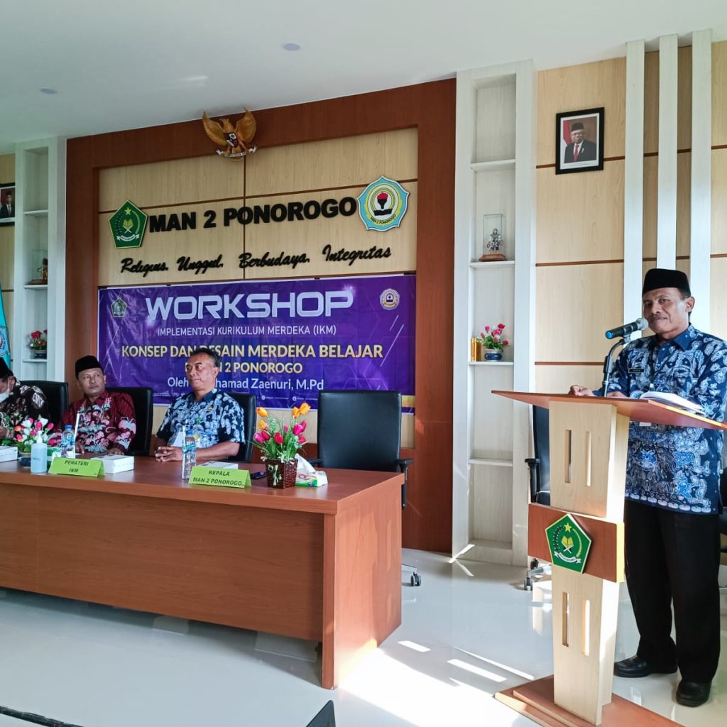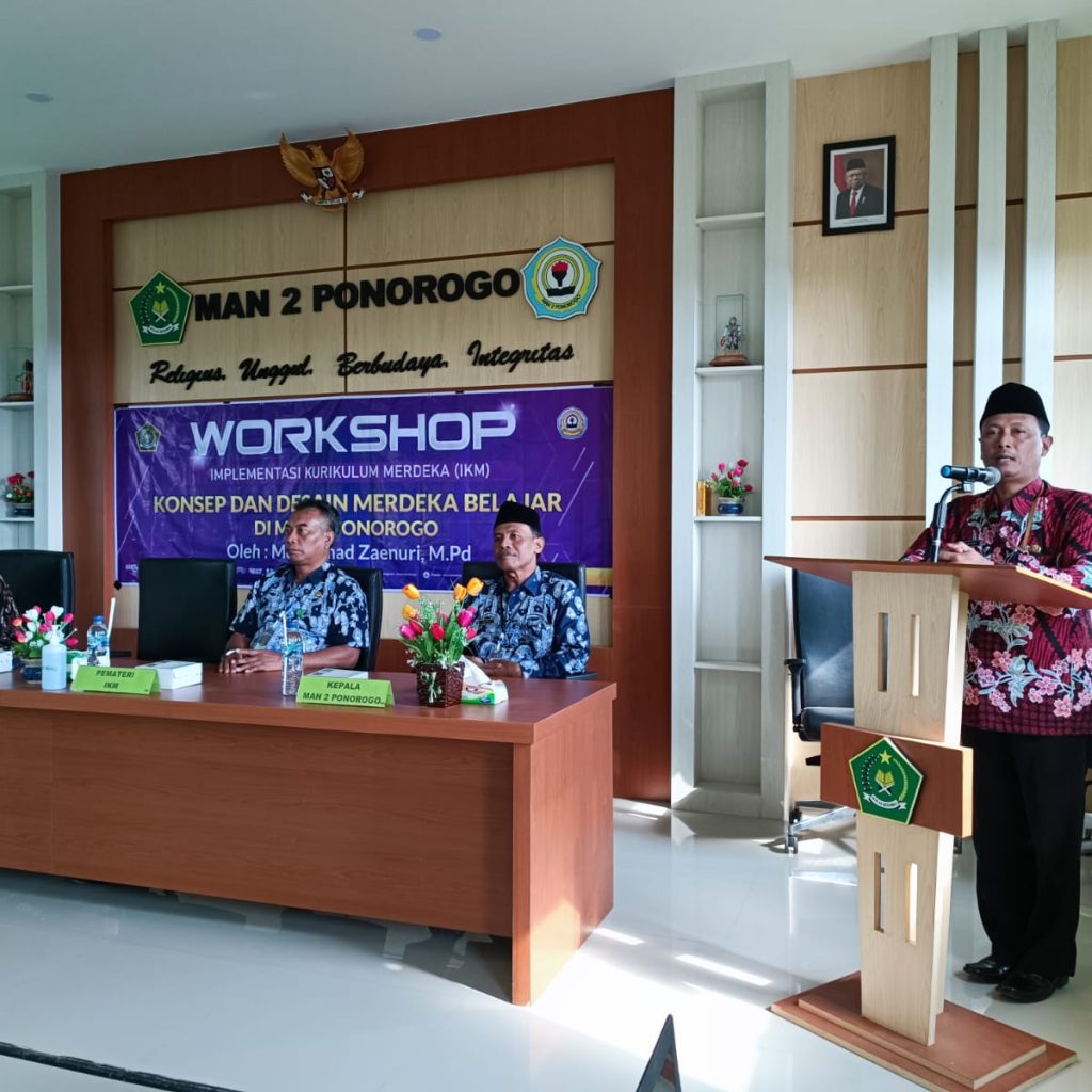 Salah satu langkah yang dilakukan oleh MAN 2 Ponorogo adalah dengan melaksanakan workshop konsep dan desain Kurikulum Merdeka bersama bapak Mochamad Zaenuri, M. Pd. (Pengawas KanKemenag Mojokerto sekaligus tim penyusun KMA 347 Tentang Kurikulum Merdeka pada Madrasah) yang diselenggarakan di aula MAN 2 Ponorogo pada hari Kamis, 23 Juni 2022. Workshop pertama bagi seluruh guru dan tenaga kependidikan di MAN 2 Ponorogo ini bertujuan mensosialisaikan konsep dan desain kurikulum merdeka agar seluruh guru dan tenaga kependidikan MAN 2 Ponorogo memiliki gambaran utuh tentang kurikulum merdeka dan untuk ditindaklanjuti dalam program-program yang mendukung implementasi kurikulum merdeka di tahun ajaran mendatang.