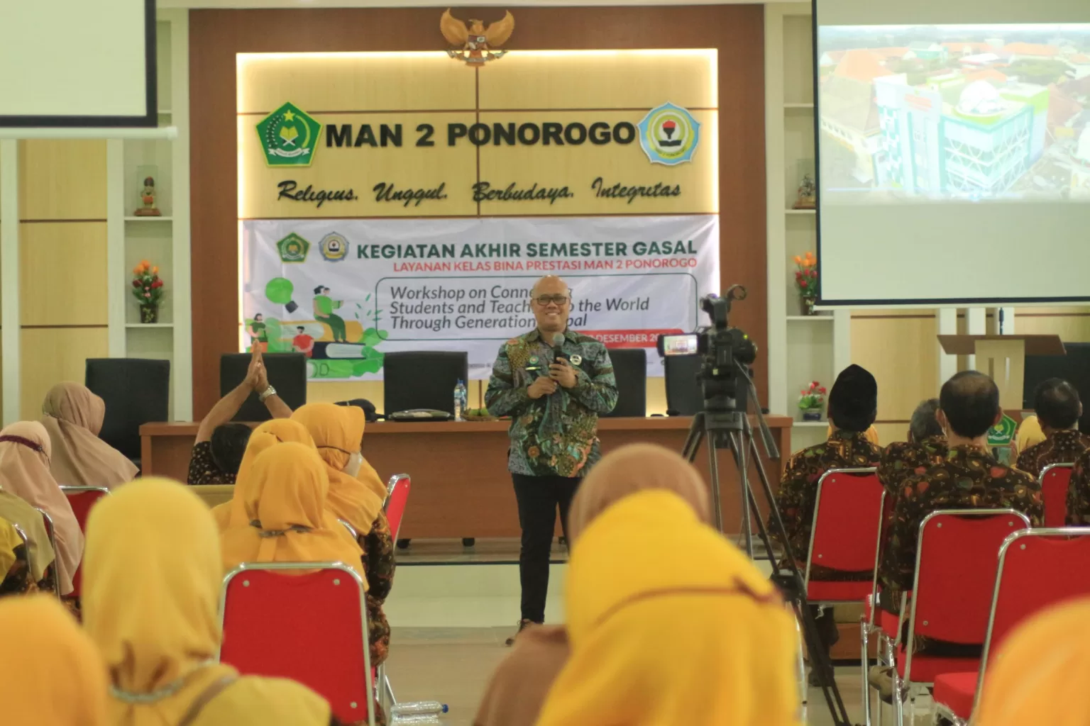 Sabtu, 18 Desember 2021, EVo – BP MAN 2 Ponorogo mengadakan kegiatan workshop “On Connecting Students and Teachers to The World Through Generation Global ” . Menurut Nyamiran, S.Pd. M.Pd.I selaku Ketua layanan Bina Prestasi sekalgus penggagas acara, kegiatan ini bertujuan agar siswa siswi MAN 2 Ponorogo lebih menguasai Bahasa Inggris dalam berinteraksi sehari hari, baik lisan maupun tulis.Selain itu mereka diharapkan  bisa menjadi bagian dari Generation Global Students.Kegiatan ini  dikuti  oleh siswa-siswi kelas X dan XI Layanan Bina Prestasi serta English Club MAN 2 Ponorogo.