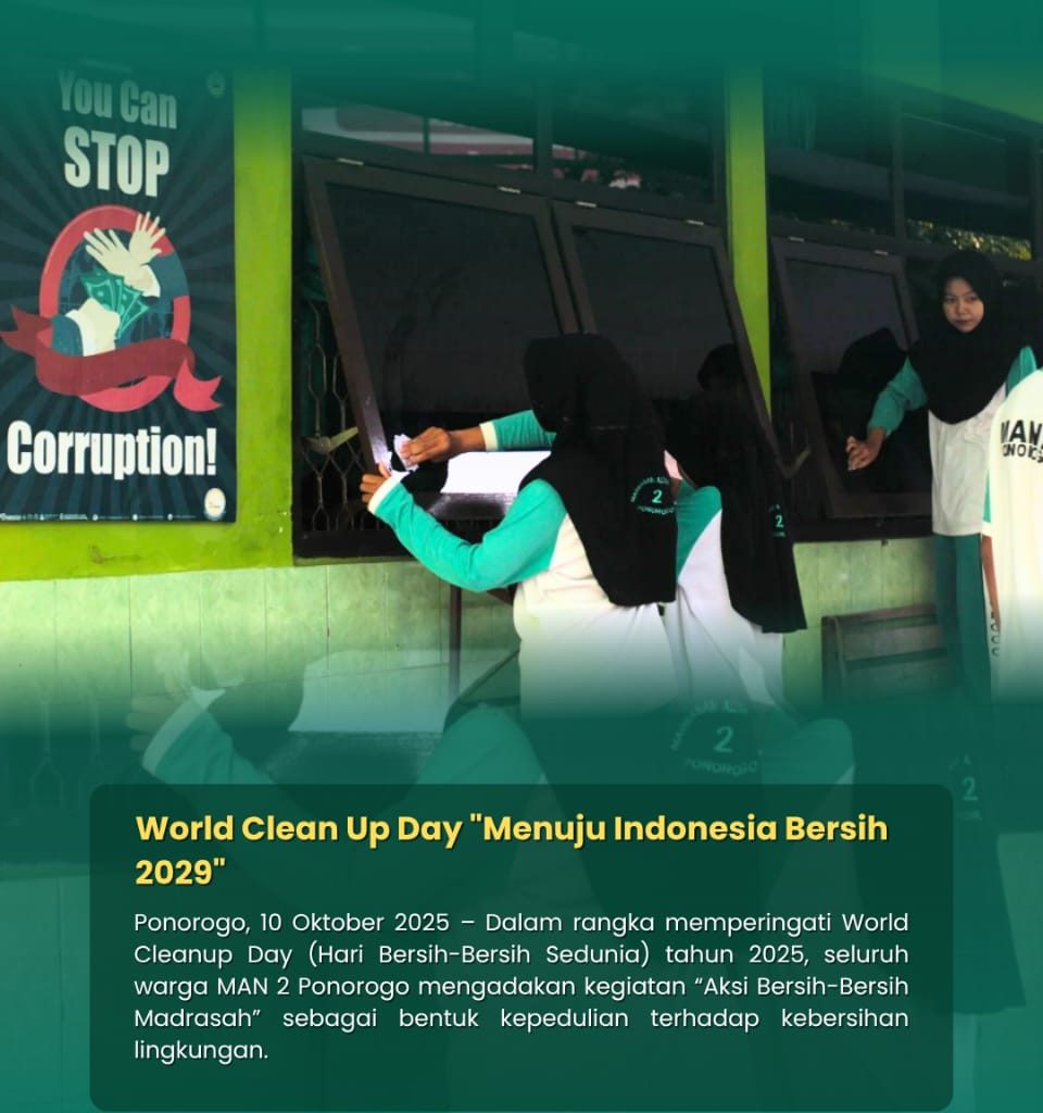 Ponorogo (10/10) – Dalam rangka memperingati World Clean Up Day (Hari Bersih-Bersih Sedunia) tahun 2025, seluruh warga MAN 2 Ponorogo mengadakan kegiatan Aksi Bersih-Bersih Madrasah sebagai bentuk kepedulian terhadap kebersihan lingkungan.